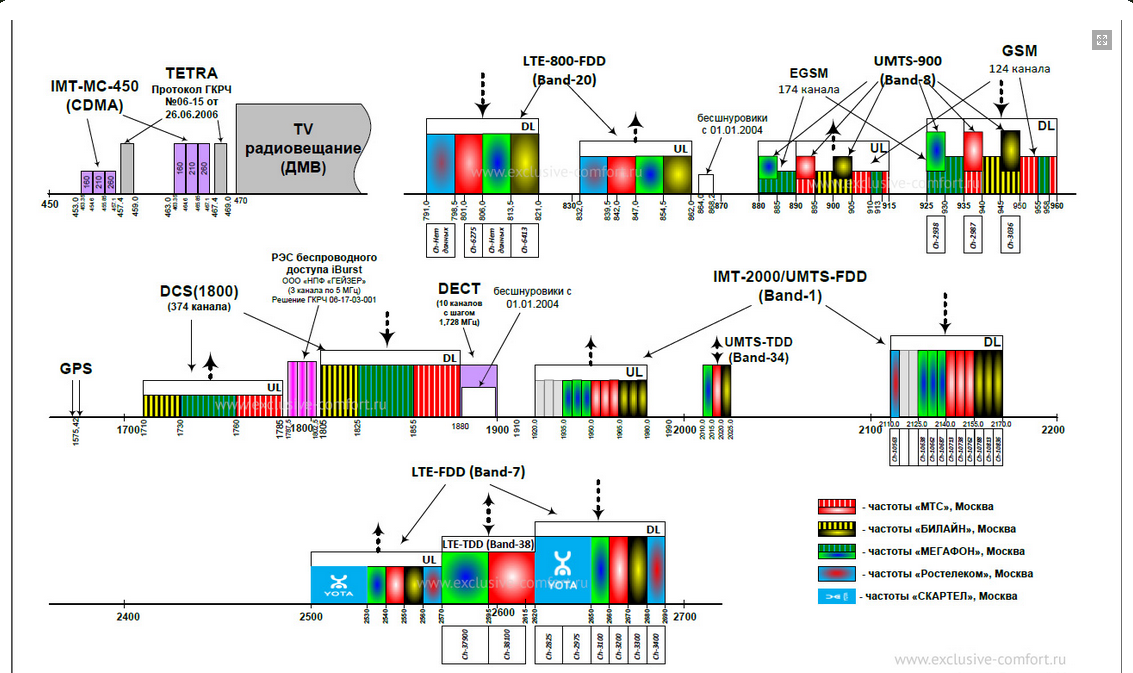 Для начала надо понимать, что так называемый “Стандарт LTE” подразумевает несколько диапазонов для различных операторов в различных регионах. Спустя пару бессонных ночей на радиотехнических форумах я нашёл вот эту картинку: